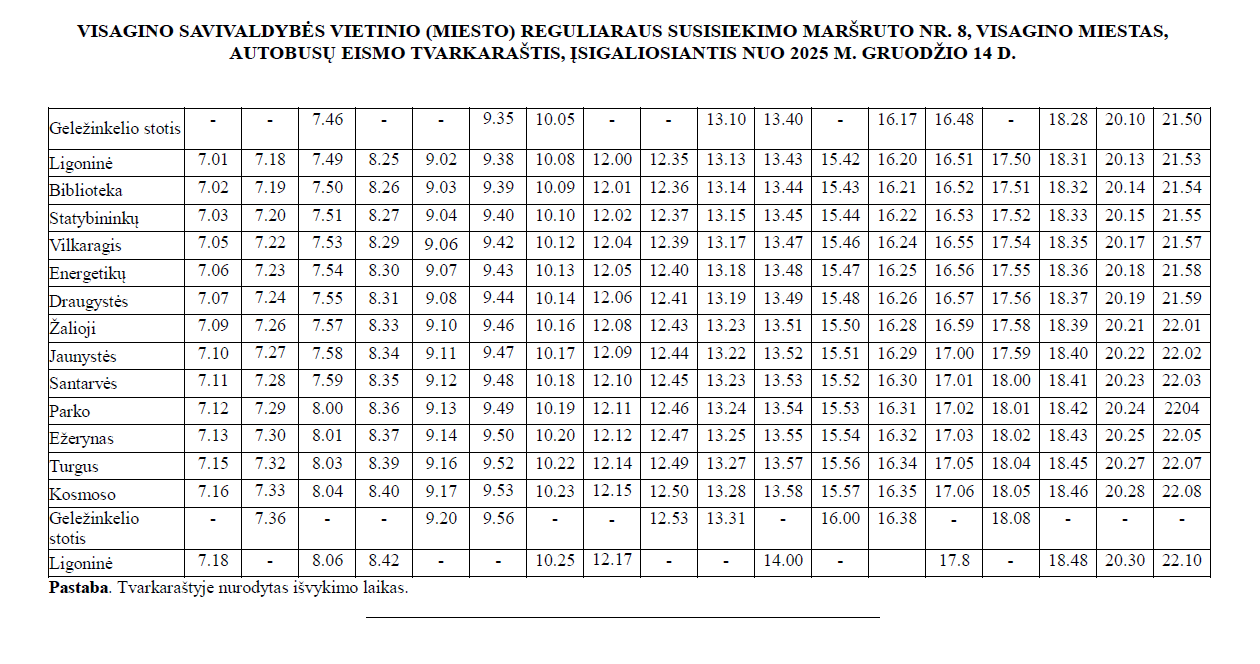 2025-12-25 ir 2026-01-01 dienomis UAB „Seknija“ autobusas išvyks iš Visagino AS 12:00 val., o iš Vilniaus AS – 15:45 val.