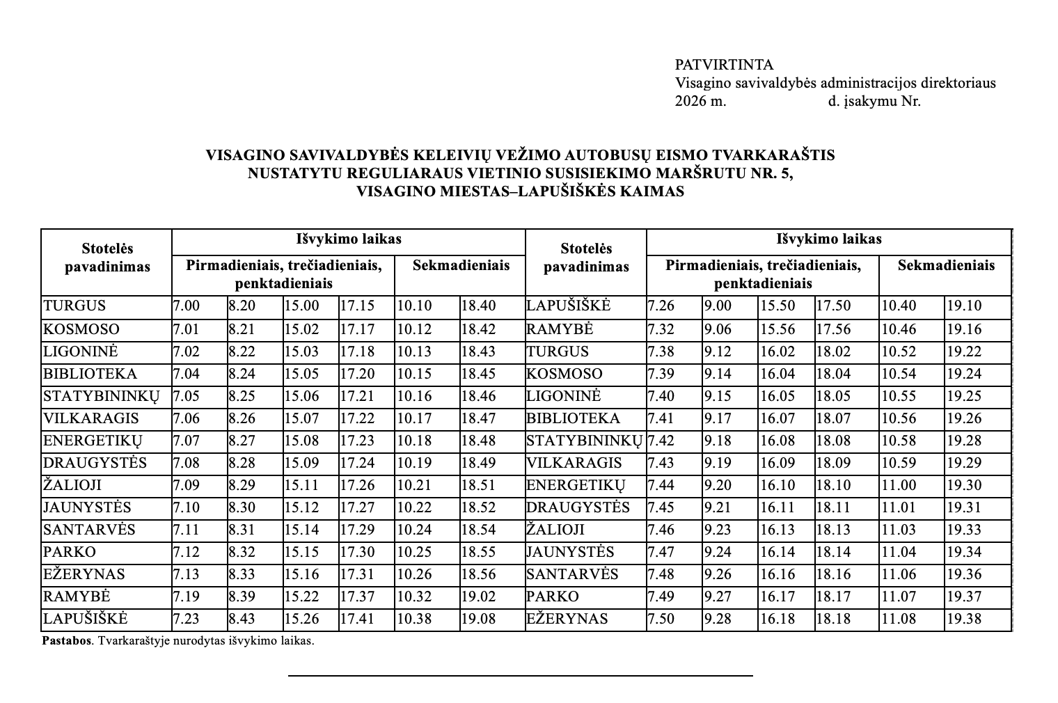 Visagino autobusų stoties maršrutų išvykimo tvarkaraštis nuo 2025 m. kovo 17 d.