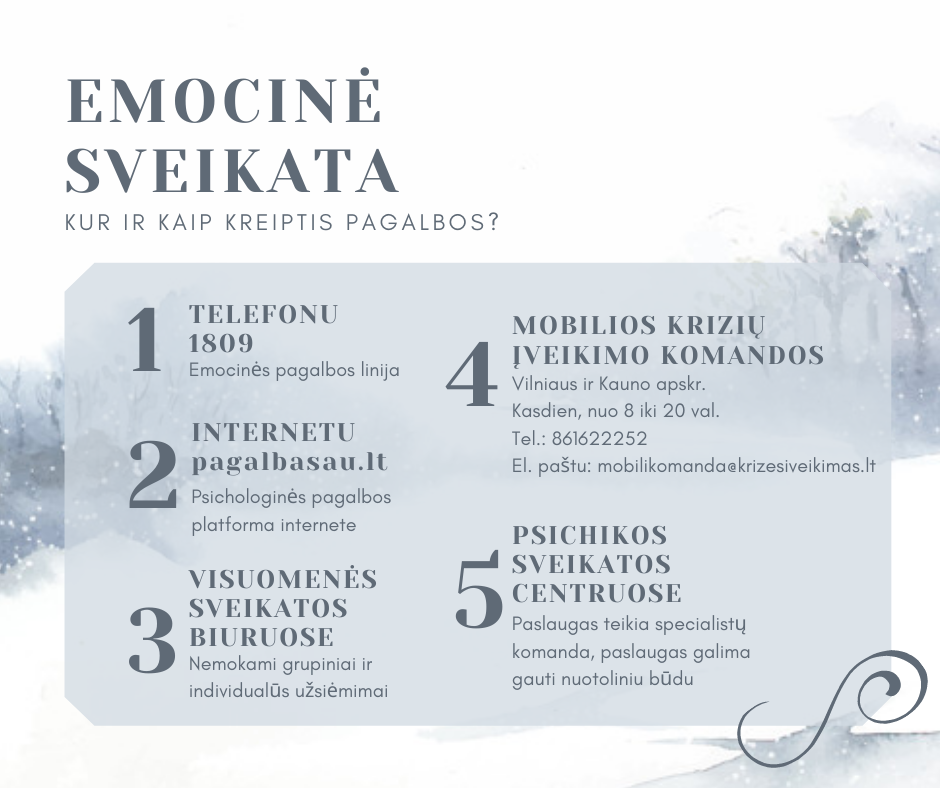 Šalyje įvedus griežtesnius karantino apribojimus, Sveikatos apsaugos ministerija (SAM) atkreipia dėmesį į psichologinę bei emocinę žmonių sveikatą. Karantino metu pasikeitus įprastam gyvenimo ritmui bei artėjant didžiausioms žiemos šventėms daugiau žmonių susiduria su psichologinėmis problemomis. Ministerija skatina visuomenę nebijoti ieškoti pagalbos ir primena, kokios šiuo metu yra galimybės bei kur galima kreiptis į specialistus.