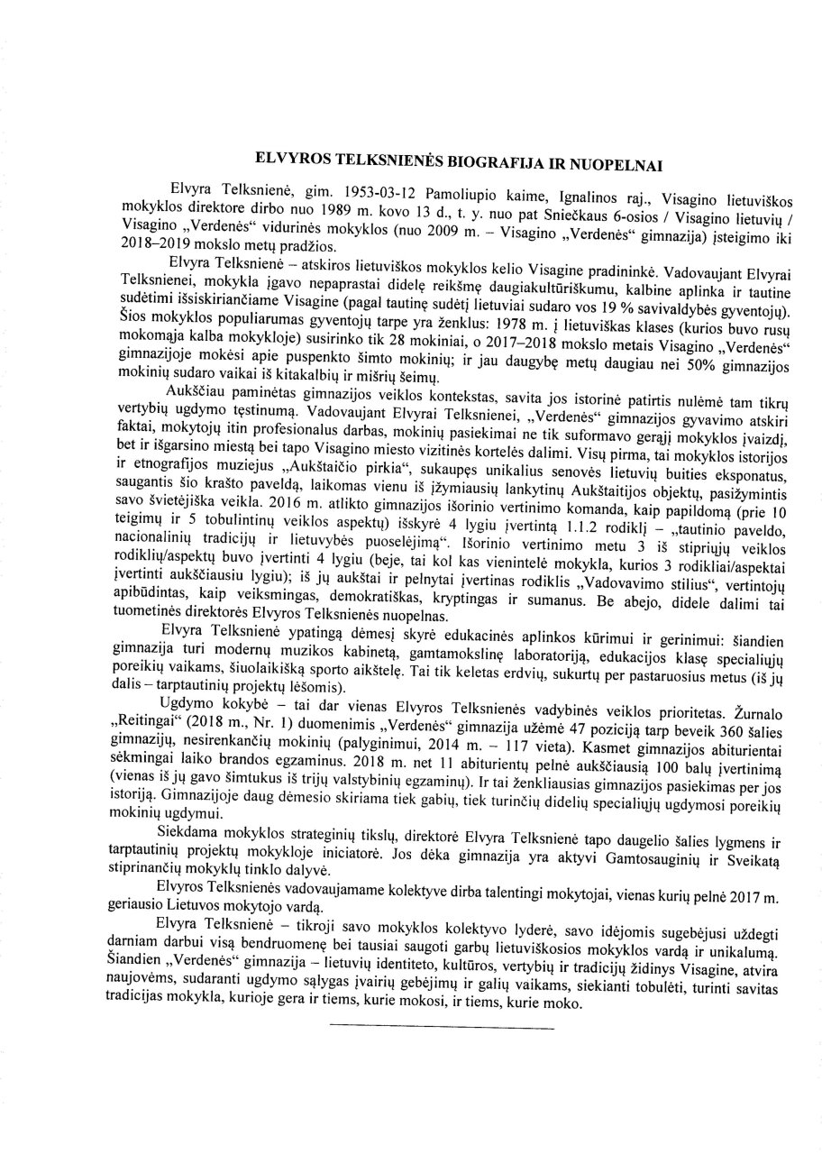 2019 m. Elvyra Telksnienė (gim. 1953 m.) – Visagino savivaldybės tarybos 2019 m. sausio 31 d. sprendimu Nr. TS-20 „Dėl Visagino miesto Garbės piliečio vardo suteikimo Elvyrai Telksnienei“ buvo suteiktas Visagino miesto Garbės piliečio vardas Elvyrai Telksnienei už svarų indėlį puoselėjant tautinį paveldą, nacionalines tradicijas ir lietuvybę Visagino savivaldybėje. |