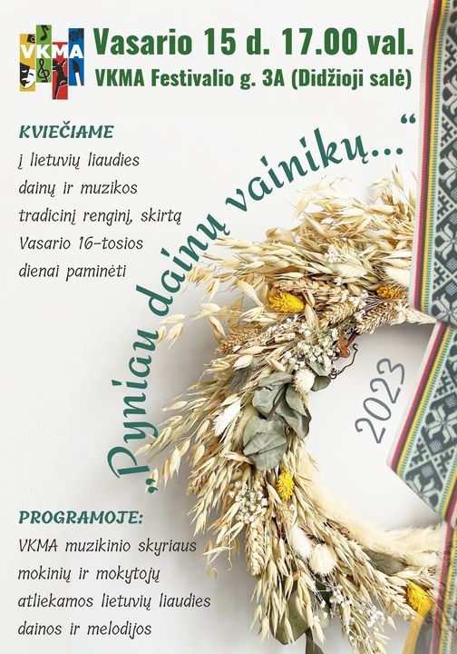 Kviečiame į lietuvių liaudies dainų ir muzikos tradicinį renginį „Pyniau dainų vainikų...“, skirtą Vasario 16-tosios dienai paminėti.