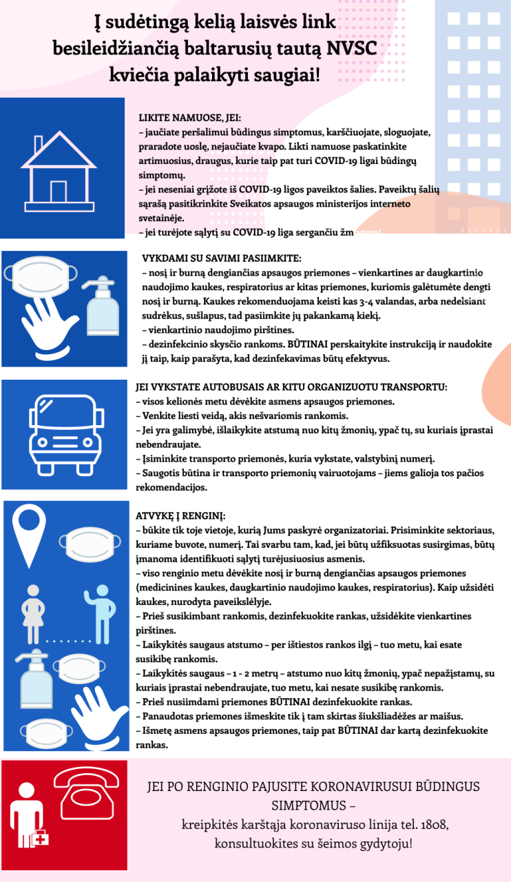 Imtis visų koronaviruso (COVID-19) infekcijos prevencijos priemonių, saugoti save ir kitus – tą daryti visus dalyvausiančius šį sekmadienį vyksiančioje palaikymo Baltarusijai akcijoje „Laisvės kelias“ ragina Nacionalinis visuomenės sveikatos centras (NVSC). Be to, specialistai įspėja žmones, jaučiančius koronavirusinei infekcijai būdingus simptomus – karščiuojančius, kosinčius, sloguojančius, praradusius uoslės ir skonio jausmą ar turinčius kitų sveikatos nusiskundimų – jokiu būdu nevykti į renginius, stebėti juos nuotoliniu būdu.