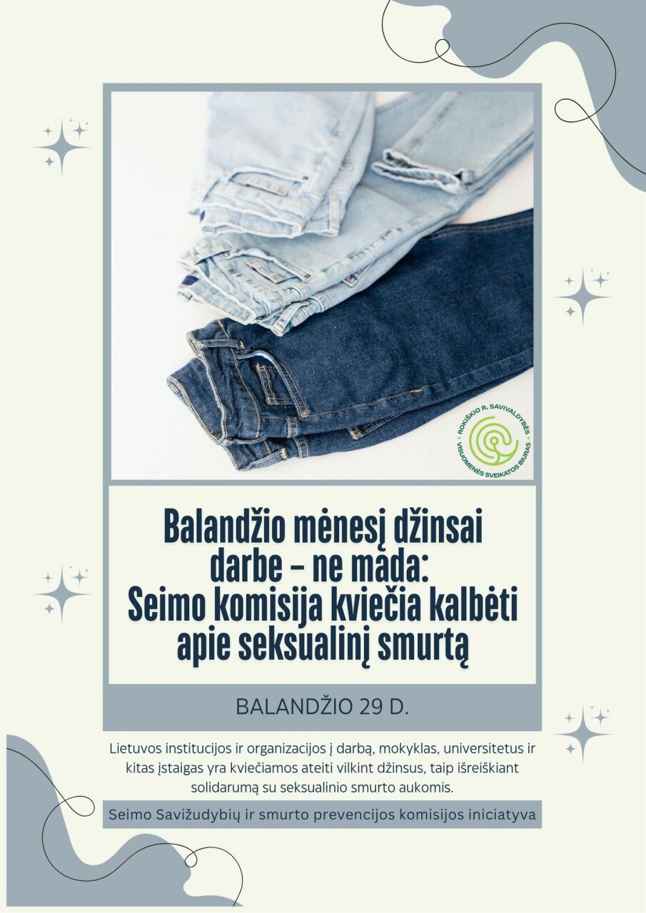Seimo Savižudybių ir smurto prevencijos komisija kviečia Lietuvos institucijas, įstaigas ir organizacijas balandžio 29 d., trečiadienį, prisijungti prie iniciatyvos – į darbą, mokyklas, universitetus ir kitas įstaigas ateiti vilkint džinsus, taip išreiškiant solidarumą su seksualinio smurto aukomis.