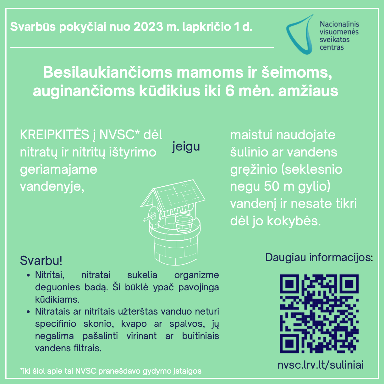 Nuo 2023 m. lapkričio 1 d. nėščioji ar kūdikio iki 6 mėnesių amžiaus tėvai (globėjai) ar jų įgalioti asmenys turi tiesiogiai kreiptis į Nacionalinį visuomenės sveikatos centrą prie Sveikatos apsaugos ministerijos (toliau – NVSC) dėl geriamojo vandens užterštumo nitratais ir nitritais tyrimų, jeigu maistui vartoja individualių šachtinių šulinių ar seklesnių negu 50 m gylio gręžinių geriamąjį vandenį.