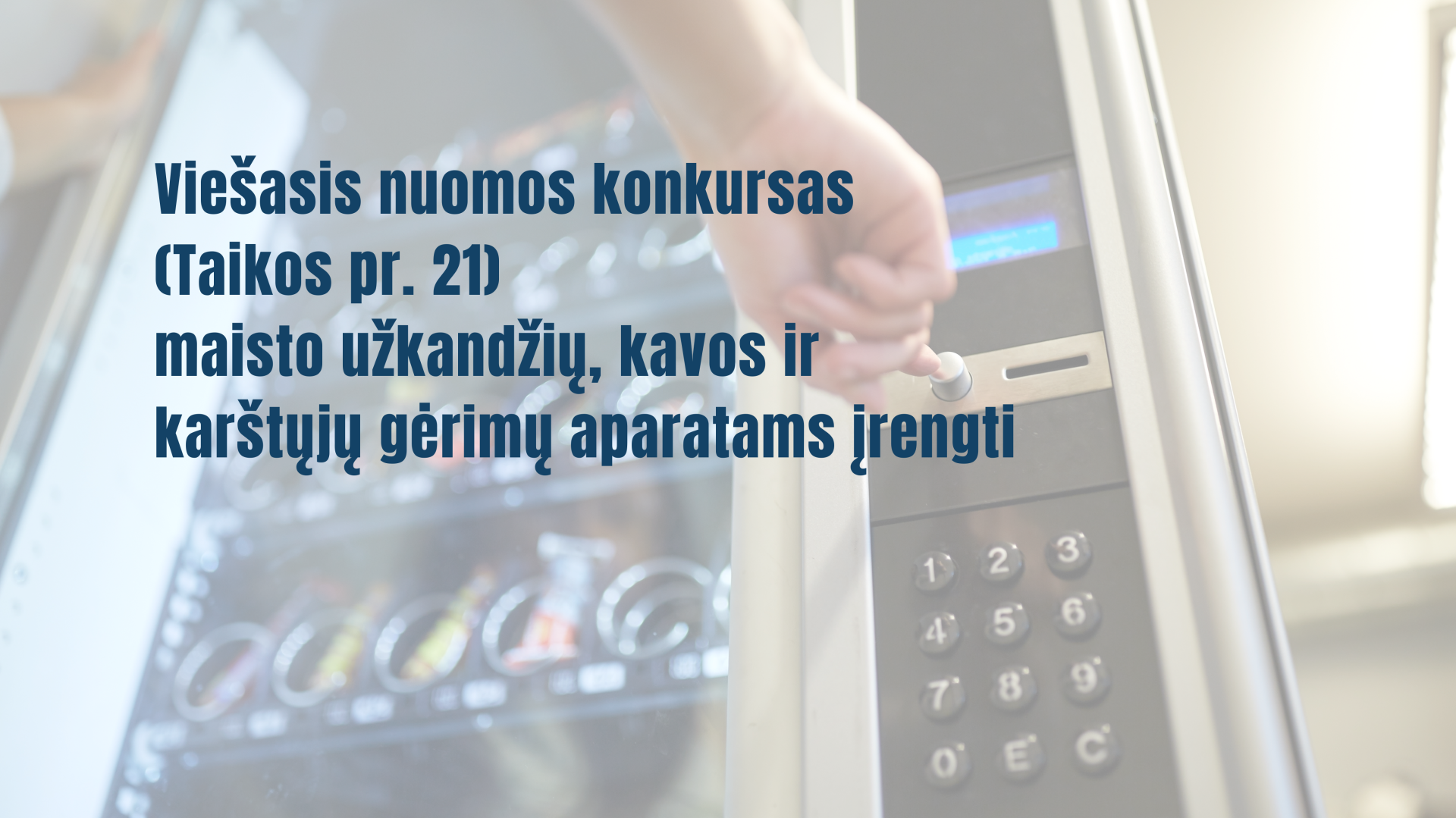 Visagino „Verdenės“ gimnazija, kodas 190243519, Taikos pr. 21, Visaginas (toliau – Nuomotojas), viešojo nuomos konkurso būdu išnuomoja nekilnojamąjį turtą – 1,0 kv. m ir 0,5 kv. m ploto patalpas, esančias Visagine, Taikos pr. 21 (pastato unikalus Nr. 3098-8003-7010) maisto užkandžių ir kavos bei karštųjų gėrimų aparatams įrengti.