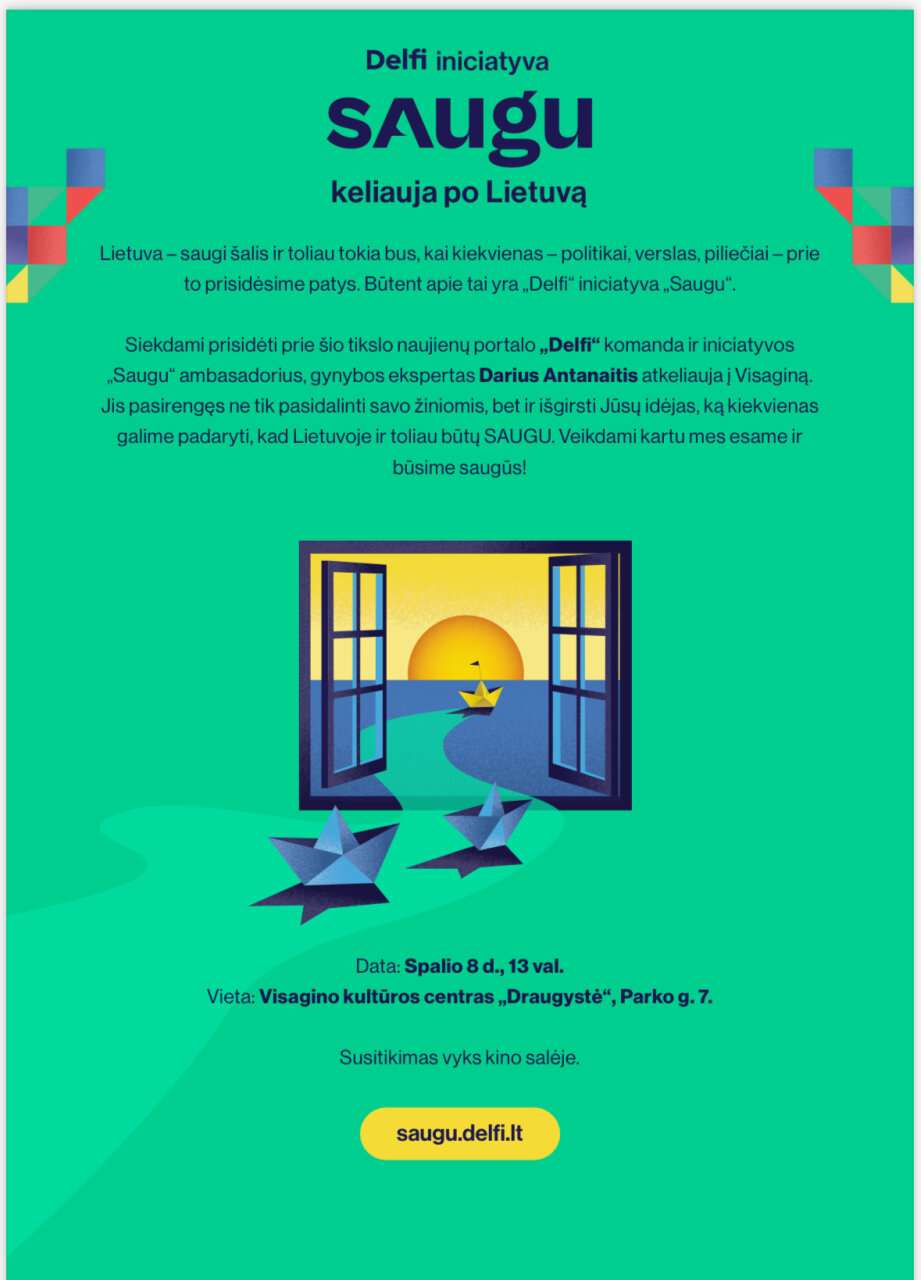Siekdami prisidėti prie šio tikslo naujienų portalo „Delfi“ komanda ir iniciatyvos „Saugu“ ambasadorius, gynybos ekspertas Darius Antanaitis atkeliauja į Visaginą. Jis pasirengęs ne tik pasidalinti savo žiniomis, bet ir išgirsti Jūsų idėjas, ką kiekvienas galime padaryti, kad Lietuvoje ir toliau būtų SAUGU. Veikdami kartu mes esame ir būsime saugūs!