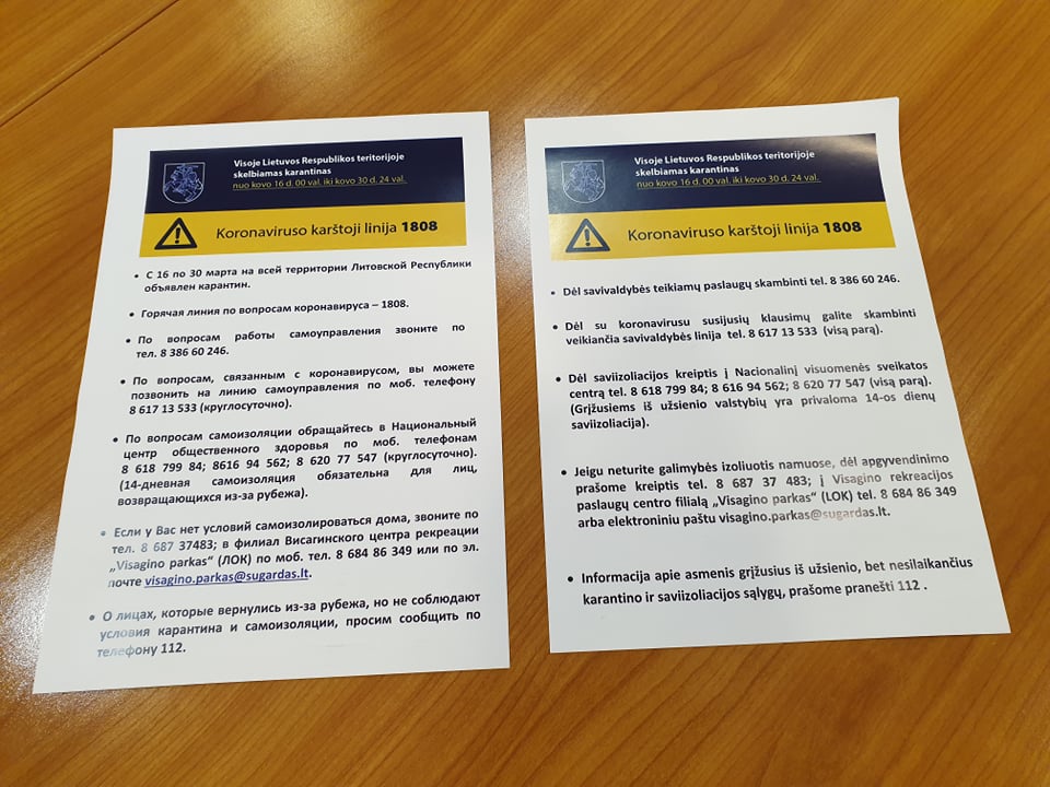Siekiame, kad patikima informacija apie karantiną pasiektų visus Visagino gyventojus. Tokie informaciniai plakatai artimiausiu metu atsiras kiekvienoje laiptinėje. Jeigu Jūsų laiptinėje tokio plakato nėra, prašome kreiptis į Visagino savivaldybės administraciją telefonu (8 386) 31551 ar el. paštu direktorius@visaginas.lt.