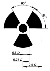 Pagrindinis jonizuojančiosios spinduliuotės ženklas, žymintis jonizuojančiosios spinduliuotės arba radioaktyviųjų medžiagų buvimą, turi būti suprojektuotas taip, kad būtų laikomasi standarte nustatytų proporcijų, pavaizduotų 2 pav. Ženklas turi būti gerai matomas ir tokio dydžio, kad atitiktų įrangos ar medžiagos, prie kurios jis tvirtinamas, dydį. Kaip jau minėta, prie ženklo gali būti pridedami papildomi žodžiai arba papildomi ženklai. Rekomenduojama naudoti tik tarptautinių organizacijų konkretiems tikslams patvirtintus papildomus ženklus.