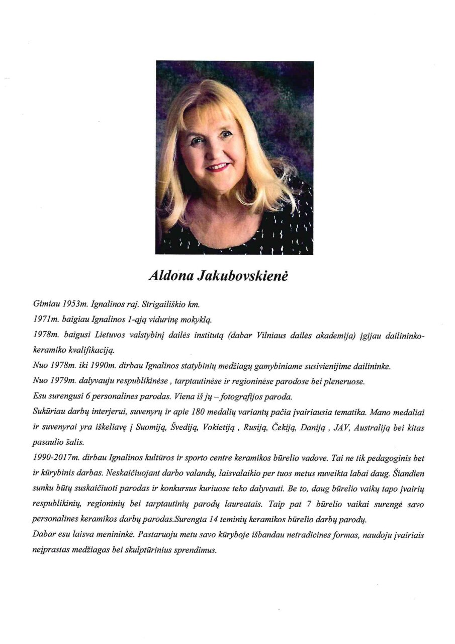 Liepos 24–rugpjūčio 30 d. Visagino viešosios bibliotekos Meno galerijoje-skaitykloje (Sedulinos al. 14/3) veiks Aldonos Jakubovskienės, įvairių keramikų konkursų laureatės, keramikos darbų paroda.