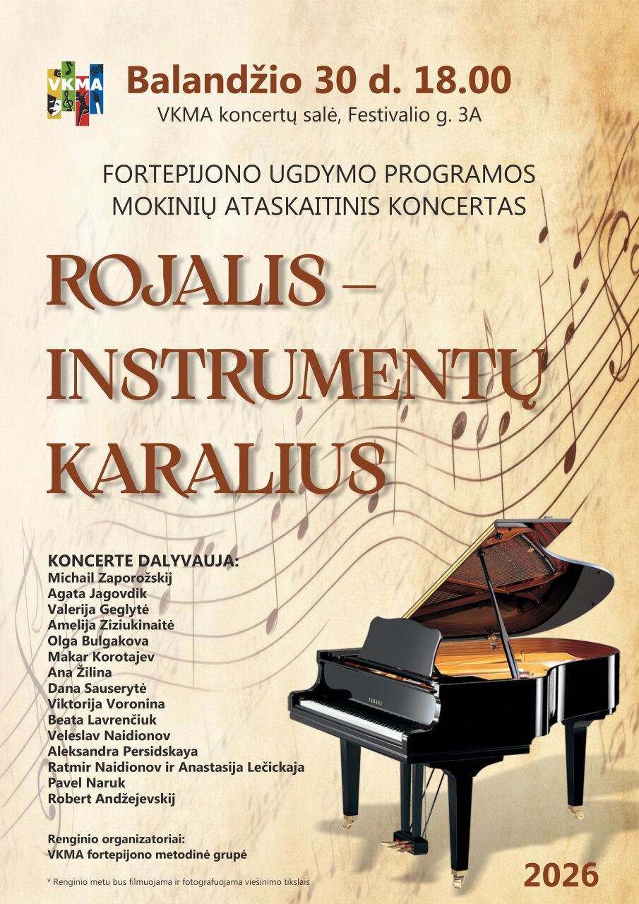 Balandžio 30 d. 18.00 val. (VKMA Koncertų salė, Festivalio g. 3 A) kviečiame į VKMA fortepijono ugdymo programos mokinių ataskaitinį koncertą „ROJALIS – INSTRUMENTŲ KARALIUS“.