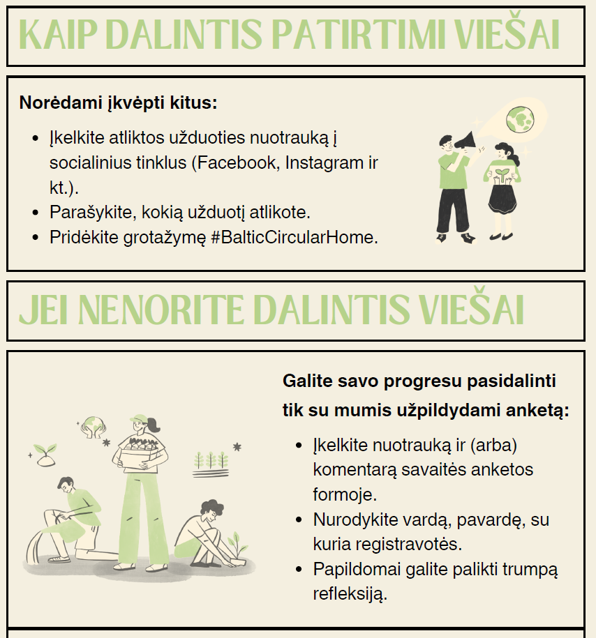 Dalyvauti gali visi – tiek pavieniai asmenys, tiek šeimos, draugai ar bendruomenės. Užduotys paprastos, pritaikytos kasdieniam gyvenimui, o norint pasidalinti savo progresu užteks įkelti trumpą įrašą socialiniuose tinkluose su grotažyme #BalticCircularHome arba užpildyti anketą.