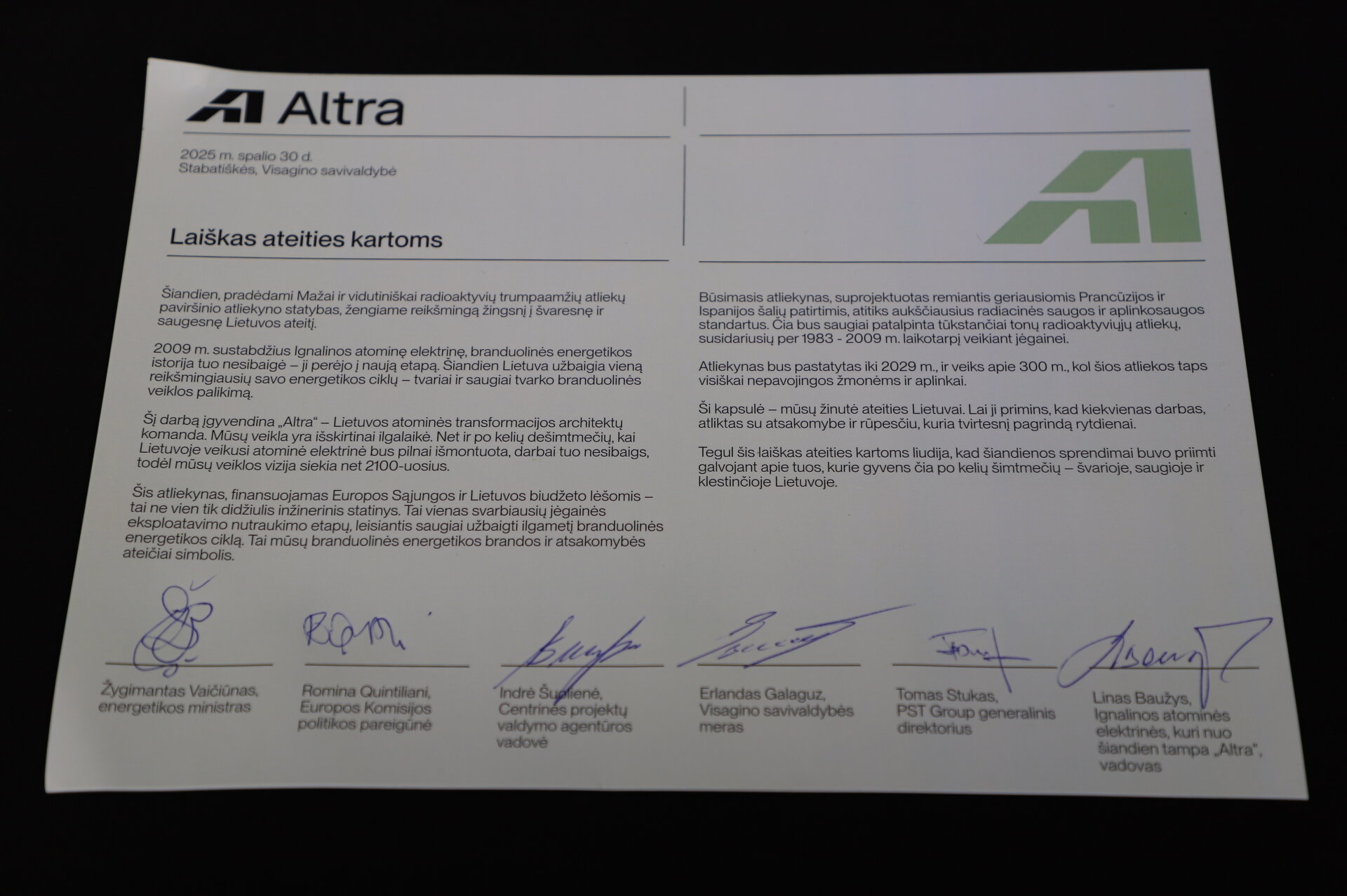 Šiandien, spalio 30 dieną, Visagino savivaldybės meras Erlandas Galaguz buvo pakviestas į simbolinę „laiko kapsulės“ ateities kartoms įkasimo ceremoniją. Šis įvykis – tai VĮ Ignalinos atominės elektrinės („Altra“) vieno svarbiausių infrastruktūros projektų – mažai ir vidutiniškai radioaktyvių trumpaamžių atliekų paviršinio atliekyno – statybų pradžios simbolis.