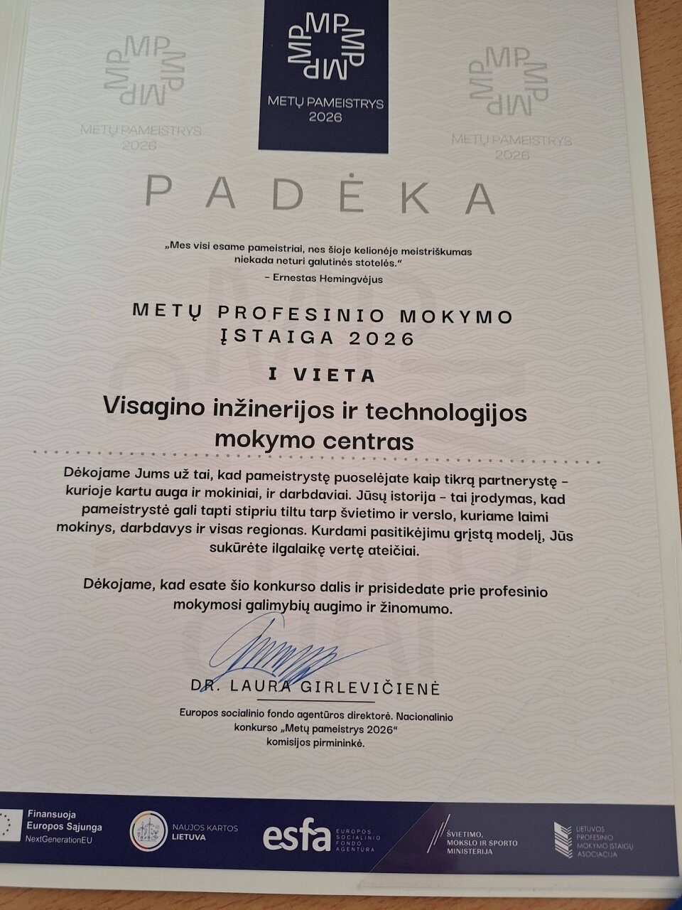 „Metų profesinio mokymo įstaiga 2026“