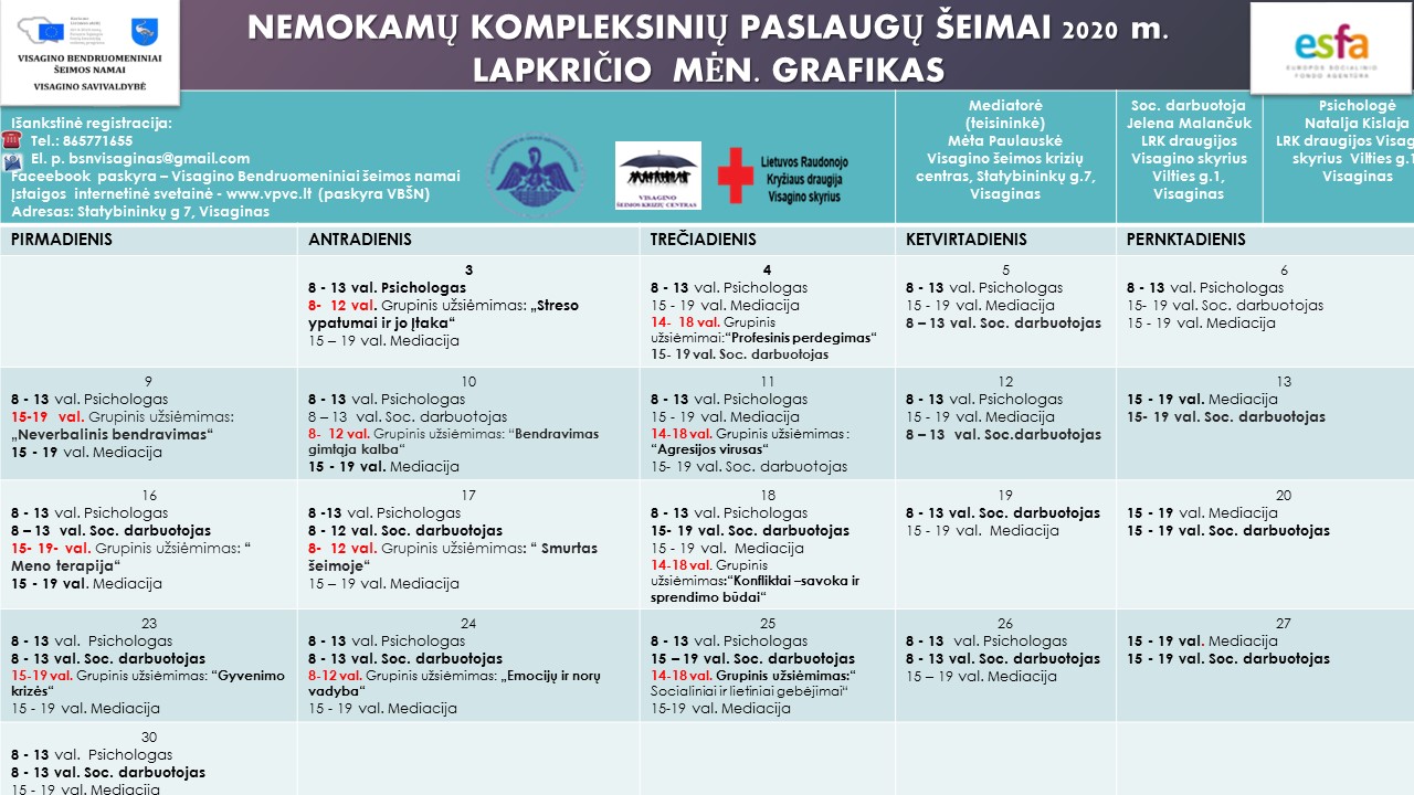 Mieli Visagino gyventojai, Visagino Bendruomeniniai šeimos namai kviečia visus norinčius pasinaudoti nemokamomis kompleksinėmis paslaugomis šeimai. Pristatome 2020 m. LAPKRIČIO mėnesio veiklos grafiką.
