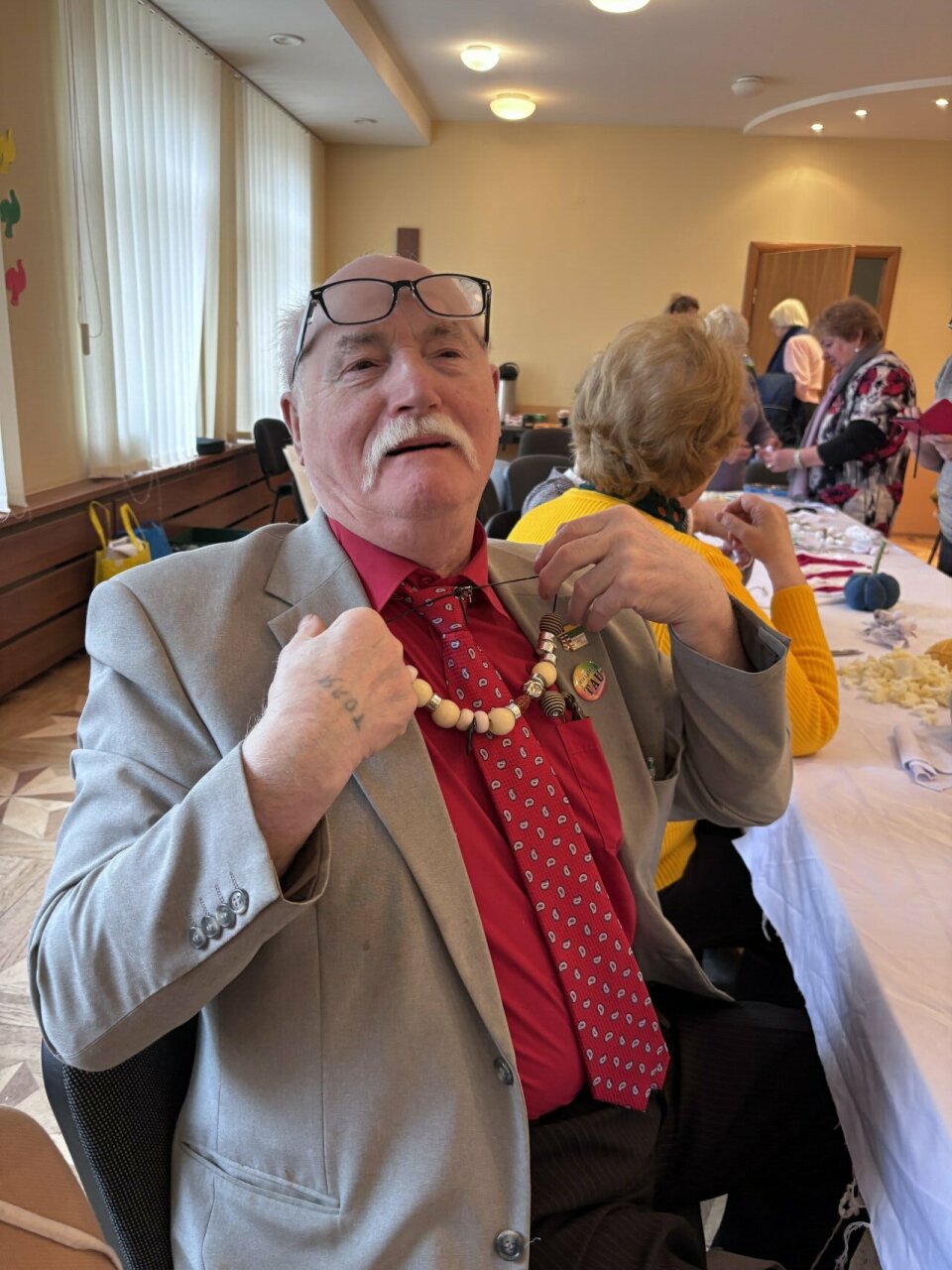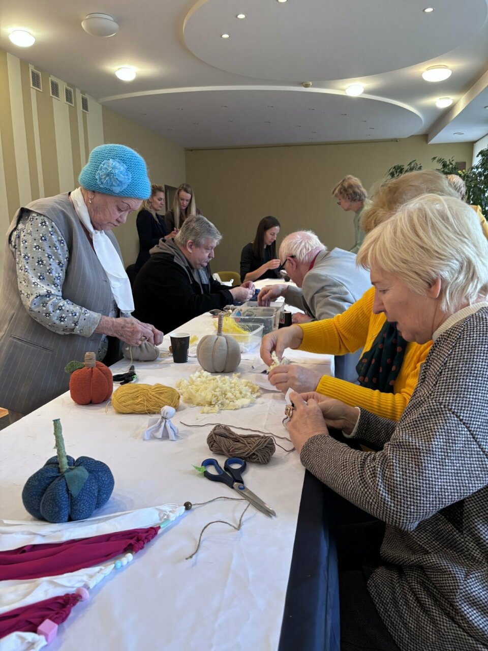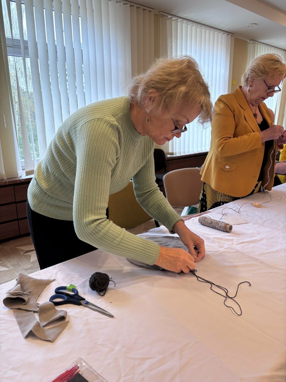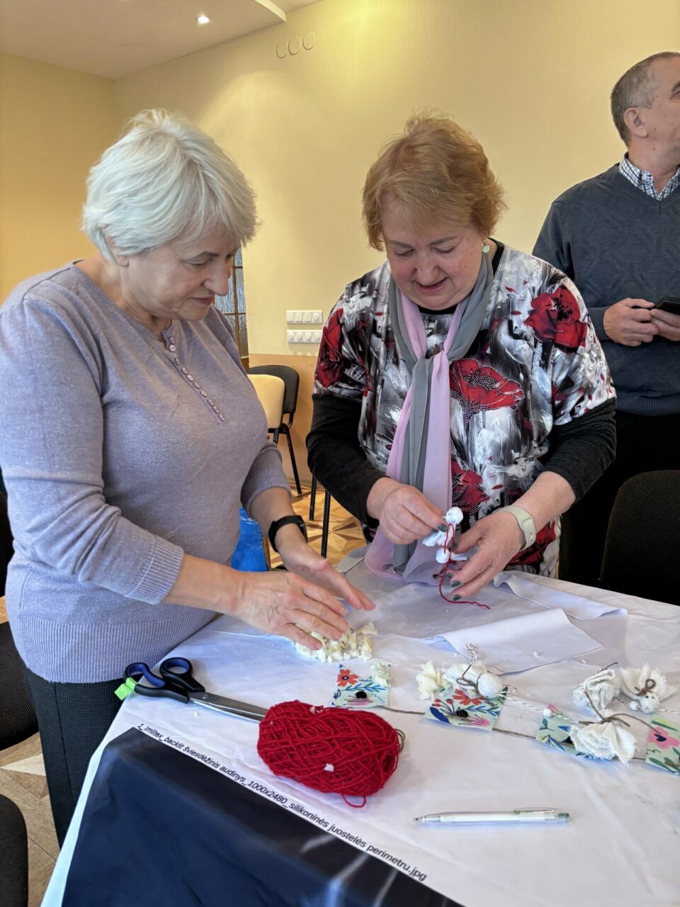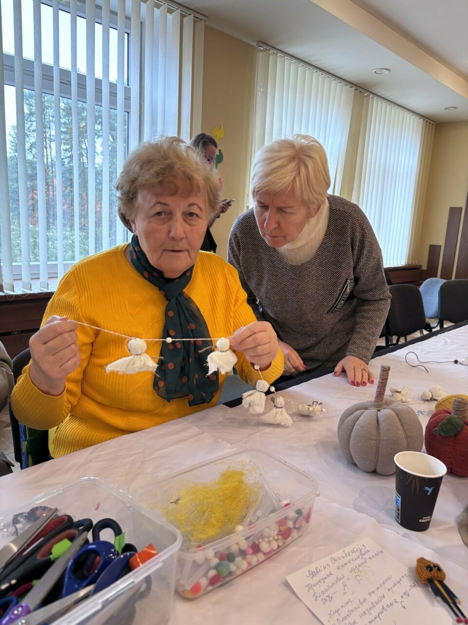 Vėliau visi buvo pakviesti į rudenines kūrybines dirbtuvėles, kuriose iš gamtinių ir antrinių žaliavų buvo kuriami spalvingi rudeniški darbai. Dalyviai mokėsi derinti medžiagas, atrasti kūrybiškus sprendimus ir tvariai panaudoti turimus išteklius. Šios dirbtuvės tapo ne tik kūrybos, bet ir bendravimo erdve – prie arbatos, sausainių ir saldainių senjorai dalijosi įspūdžiais, idėjomis ir gera nuotaika.
