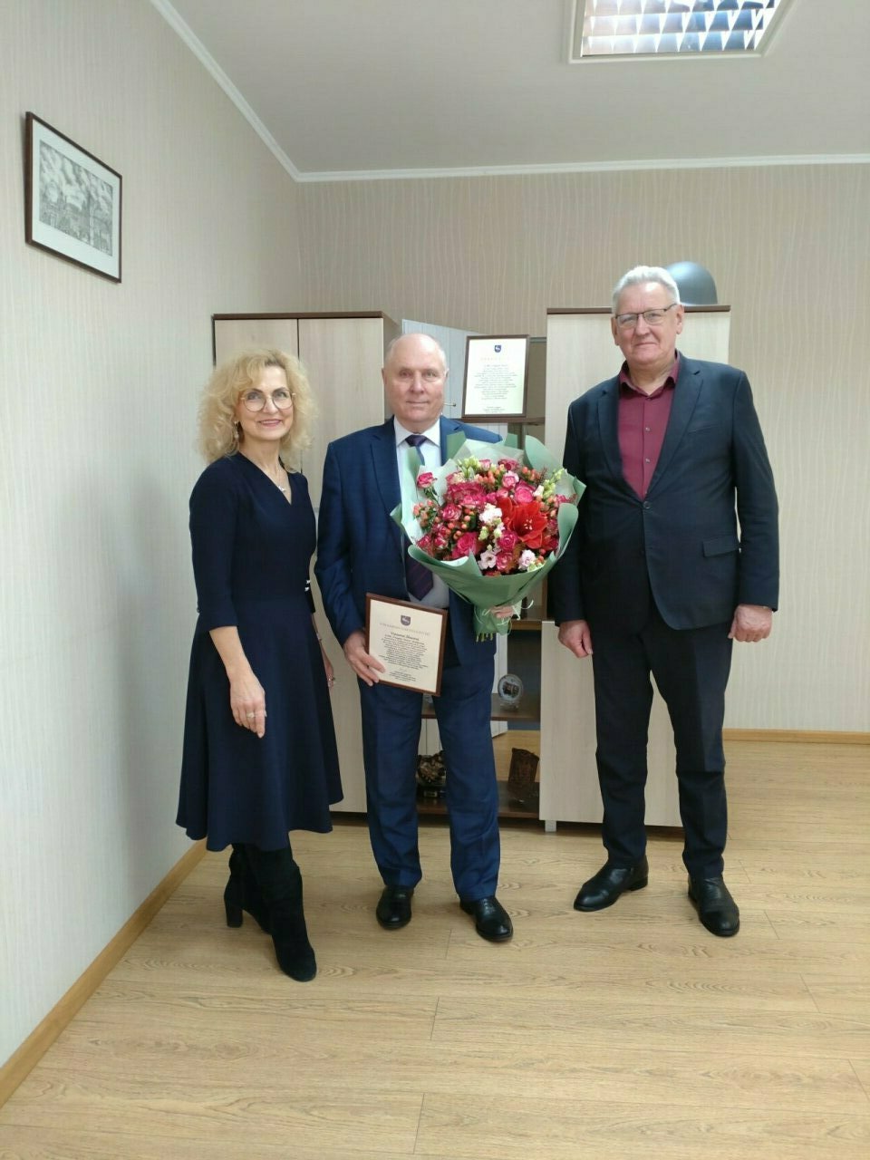 Visagino savivaldybės vicemerė Aleksandra Grigienė kartu su Visagino savivaldybės administracijos direktoriumi Virginijumi Andriumi Bukausku pasveikino UAB Visagino būsto vadovą Vytautą Šlaustą jubiliejaus proga!
