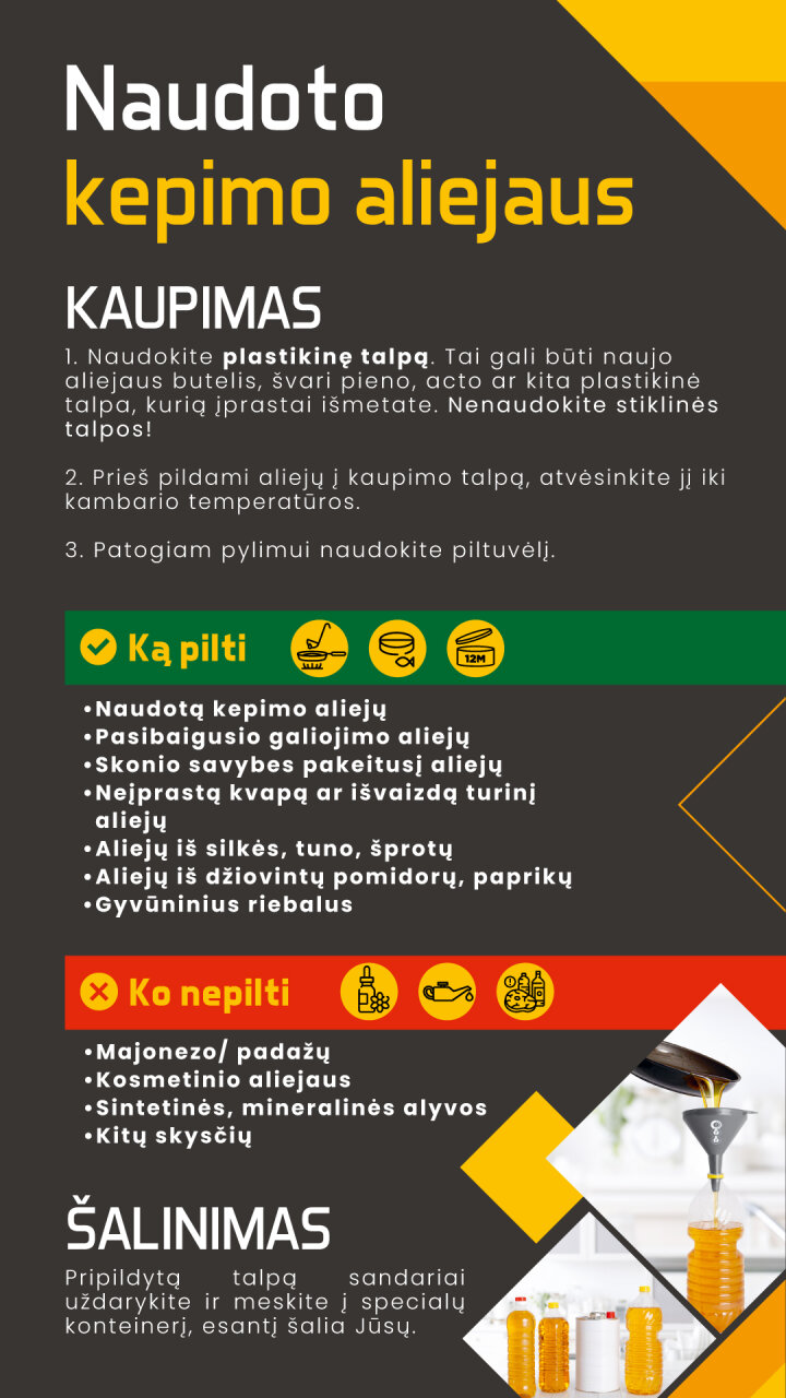 Kiekvienas iš mūsų kasdien naudojame aliejų maisto ruošimui, tačiau ne visi žinome, kaip svarbu atsakingai jį tvarkyti. Išpiltas aliejus teršia kanalizaciją, trumpina jos eksploataciją, didina priežiūros kaštus, reikalauja daugiau cheminių medžiagų indams plauti, didina vandentvarkos kaštus bei kelia pavojų gamtai. Tuo tarpu perdirbtas aliejus gali būti panaudotas biokurui gaminti – tvariam ir ekologiškam energijos šaltiniui. Surinkus ir perdirbus aliejų, mes ne tik padedame saugoti aplinką, bet ir prisidedame prie atliekų mažinimo, taip mažindami atliekų tvarkymo kaštus. Šis paprastas veiksmas gali turėti didelę įtaką mūsų miesto ekosistemai.