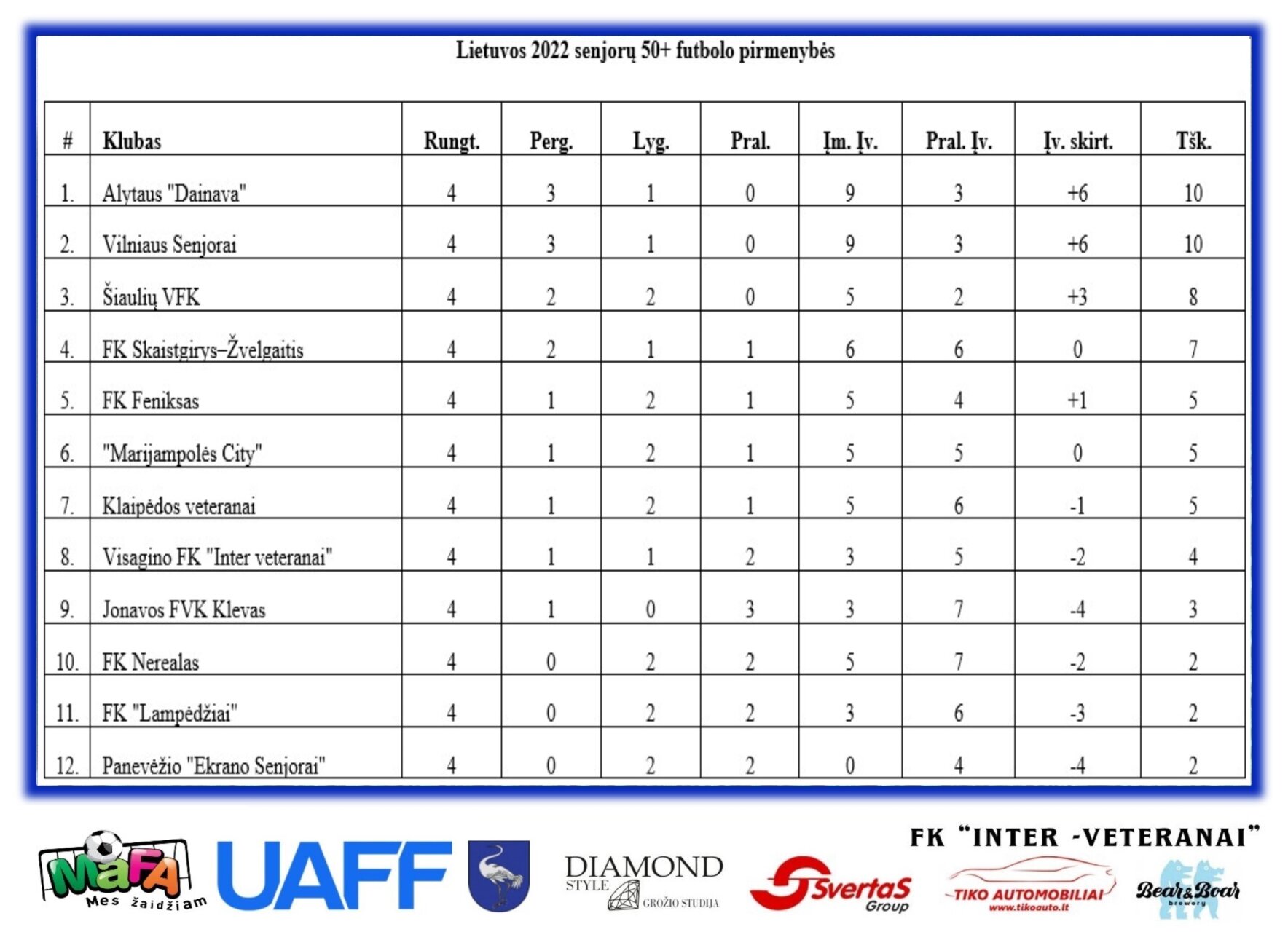 12.00 val. B aikštė (37) Visagino FK Inter veteranai – Vilniaus Senjorai