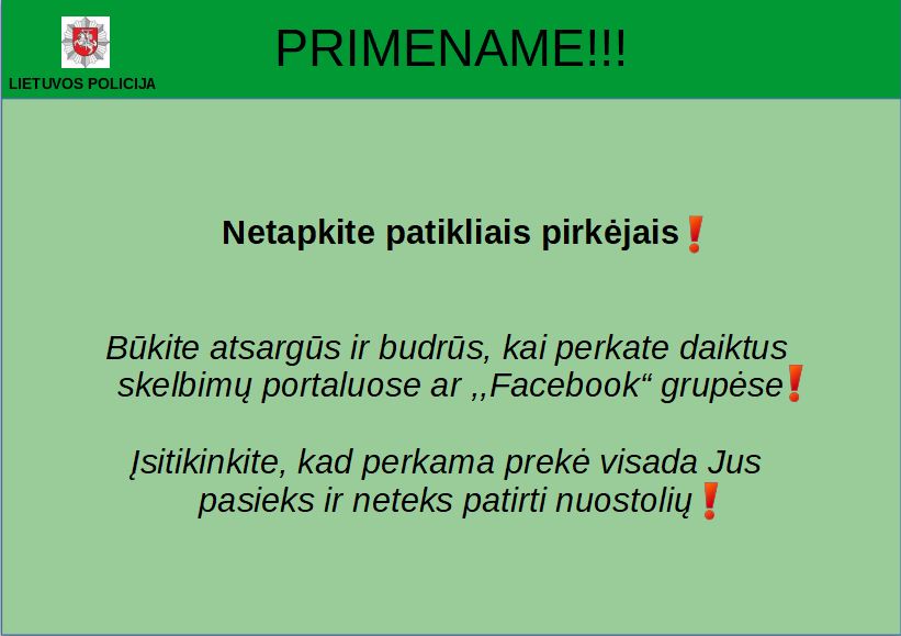 Būkite atsargūs ir budrūs, kai perkate daiktus skelbimų portaluose ar „Facebook“ grupėse. Įsitikinkite, kad perkama prekė visada Jus pasieks ir neteks patirti nuostolių.