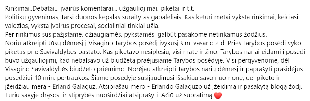 Visagino savivaldybės tarybos etikos komisija, išnagrinėjusi gautą pranešimą ir įvertinusi viešą informaciją, 2023 m. vasario 21 d. posėdyje nusprendė nepradėti tyrimo dėl Visagino savivaldybės tarybos narės Dalios Štraupaitės elgesio, kadangi 2023 m. vasario 21 d. Visagino savivaldybės tarybos narė Dalia Štraupaitė socialiniame tinkle Facebook asmeninėje paskyroje viešai atsiprašė Visagino savivaldybės mero Erlando Galaguz dėl savo elgesio 2023 m. vasario 2 d. tarybos posėdžio metu. Tekstą skaityti čia.