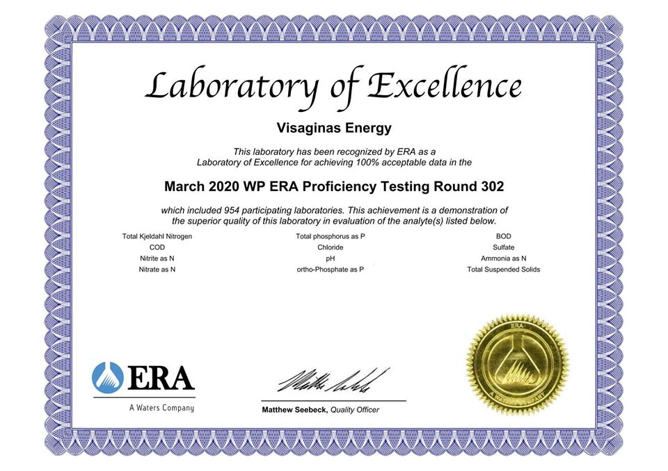 Jungtinių Amerikos Valstijų įmonė „ERA“ ir Didžiosios Britanijos LGC Standards laboratorija, sertifikuotos ir akredituotos rengti tarplaboratorinius palyginamuosius testus profesionalumo lygiui įvertinti, patvirtino UAB „Visagino energija“ chemijos ir bakteriologijos laboratorijos lygio klasę. Mūsų laboratorija gavo net tris profesionalumą patvirtinančius sertifikatus.